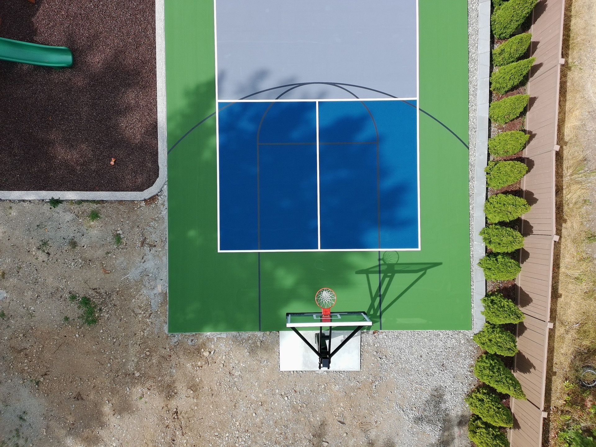 A standard pickleball court requires a minimum of 30' x 60' of space; however, we recommend 34' x 64' for an optimal play area and safety zones. We can also design modified courts for smaller spaces or multi-use courts that accommodate tennis and basketball.